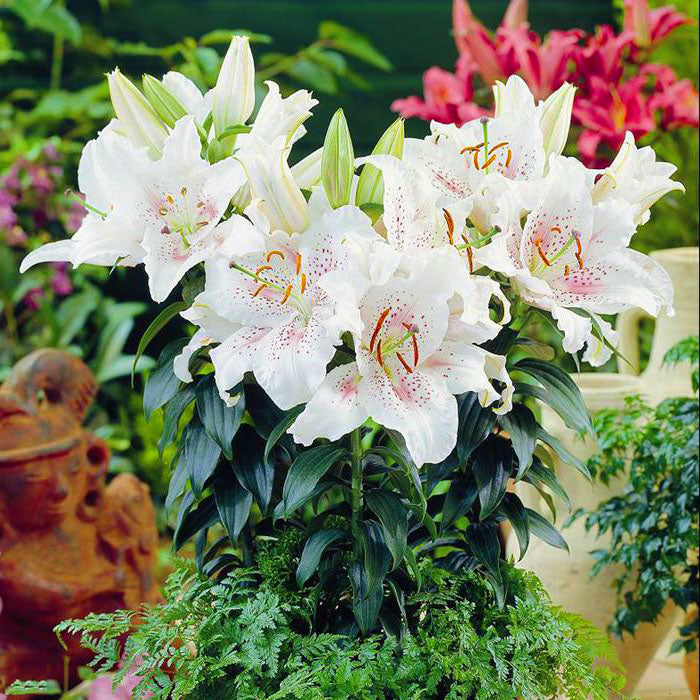 Il giglio orientale nano Muscadet porta nei giardini e sui terrazzi un’eleganza raffinata e compatta. I fiori candidi, arricchiti da sfumature rosate e leggere puntinature porpora, si aprono sopra steli robusti alti fino a 50 cm, creando scenografie armoniose anche in spazi ridotti. Le corolle ampie, vellutate e profumate diffondono fragranze dolci e persistenti, particolarmente avvertibili nelle ore serali, rendendo questa varietà ideale per giardini sensoriali.