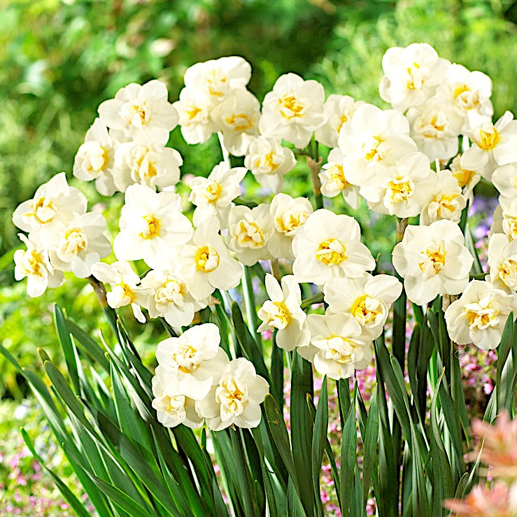 Il narciso Cheerfulness annuncia la primavera con la sua fioritura piena e armoniosa, regalando eleganza e un tocco nostalgico ai giardini. Ogni stelo porta più corolle doppie, di un bianco crema sfumato da tocchi giallo chiaro al centro, che diffondono una fragranza dolce e leggera. La composizione a grappolo dei fiori, unita alla compattezza del fogliame verde intenso, crea un colpo d’occhio suggestivo ideale per aiuole visibili anche a distanza. La varietà è apprezzata non solo per il valore estetico, ma anche per la capacità di mantenere una fioritura ordinata e uniforme, valorizzando il paesaggio primaverile in giardini privati e spazi pubblici.