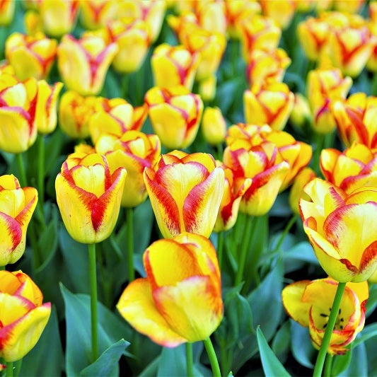Il tulipano Cape Town, con la sua combinazione cromatica intensa di giallo brillante bordato di rosso scarlatto, è una varietà capace di accendere il giardino fin dai primi giorni di primavera. La fioritura, particolarmente ricca e uniforme, si accompagna a steli robusti e diritti alti 40-50 cm, ben proporzionati rispetto al fogliame verde glauco, che sottolinea con eleganza la forma classica del fiore. Grazie al portamento eretto e alla resistenza al vento moderato, questa cultivar si adatta perfettamente a zone aperte e soleggiate, offrendo un punto focale immediato in aiuole formali o bordure miste.