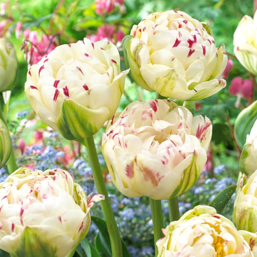 Il tulipano Danceline accende la primavera con la sua fioritura opulenta e dalla raffinatezza senza tempo. I suoi petali doppi, soffici e ricchi, si schiudono in delicate sfumature bianche ornate da leggere pennellate rosa, creando un colpo d’occhio capace di catturare l’attenzione anche nei giardini più ricchi di colori. Il portamento elegante e l’altezza equilibrata lo rendono ideale per dare movimento alle bordure e un tocco scenografico ai vasi capienti posti in posizioni di rilievo. La texture setosa dei fiori e il contrasto armonico con il fogliame verde brillante lo trasformano in un elemento di pregio per chi ama un’orticoltura di gusto classico ma dal carattere distintivo.