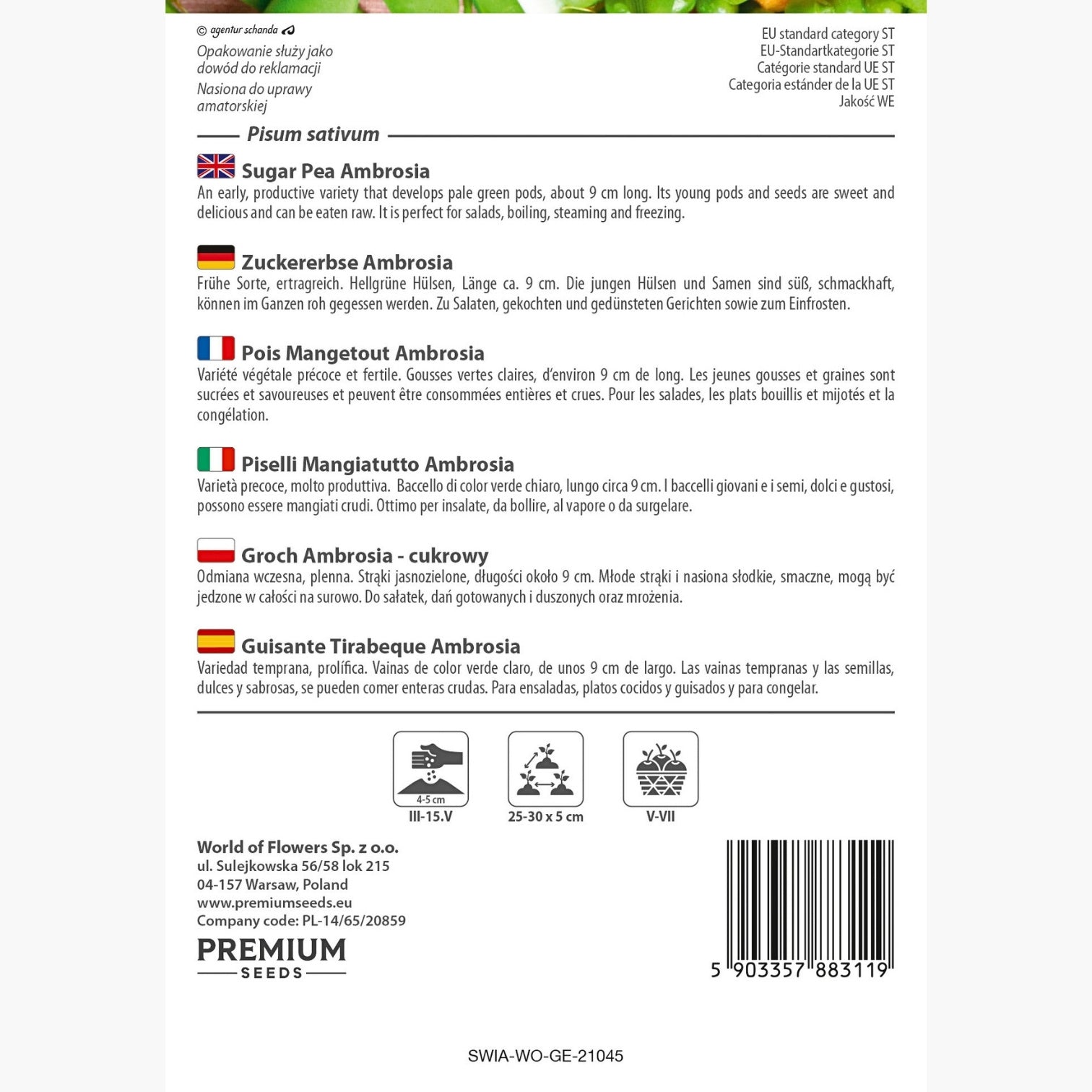 Con i semi premium dei Piselli Mangiatutto Ambrosia, avrai la possibilità di coltivare una pianta di eccezionale qualità che ti regalerà momenti di puro piacere sia in giardino che a tavola. Segui queste semplici istruzioni di cura e preparati a gustare la dolcezza naturale e la freschezza senza pari di questi prelibati piselli.