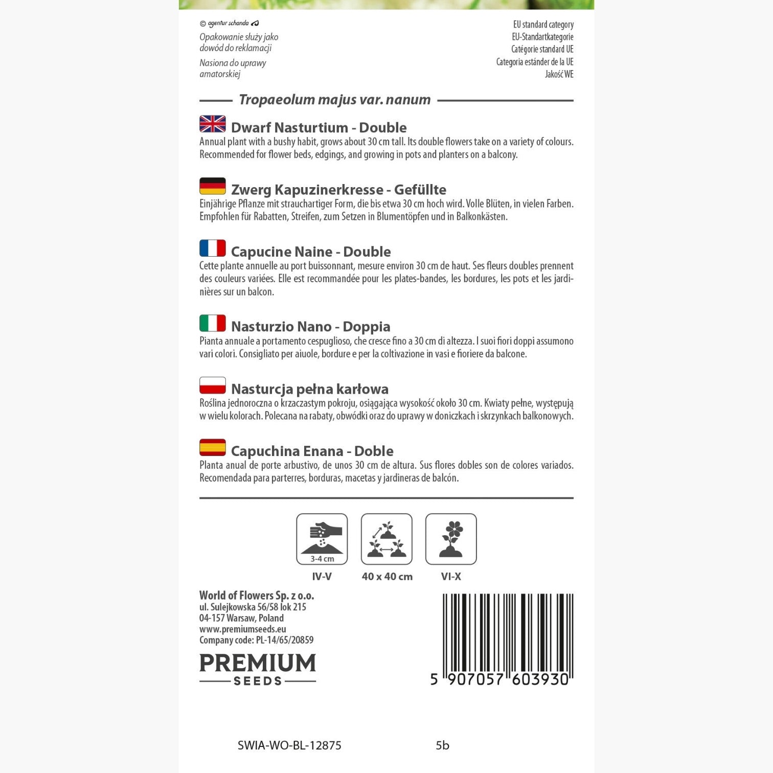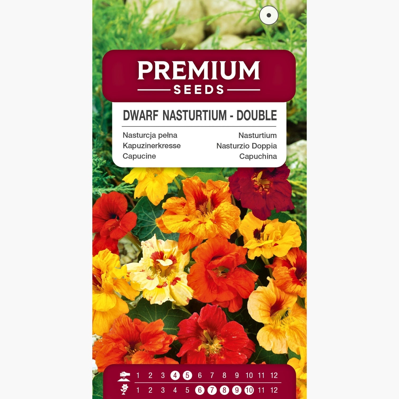 È consigliabile rispettare una distanza di 40x40 cm tra i semi per permettere a ciascun esemplare di svilupparsi senza competizione e con adeguata circolazione dell’aria. La fioritura del nasturzio nano - doppia si protrae da giugno a ottobre, garantendo un’esplosione di colori per tutta l’estate fino ai primi freschi autunnali. Durante questo periodo le infiorescenze abbondanti sono particolarmente indicate per arricchire spazi verdi o terrazzi cittadini.