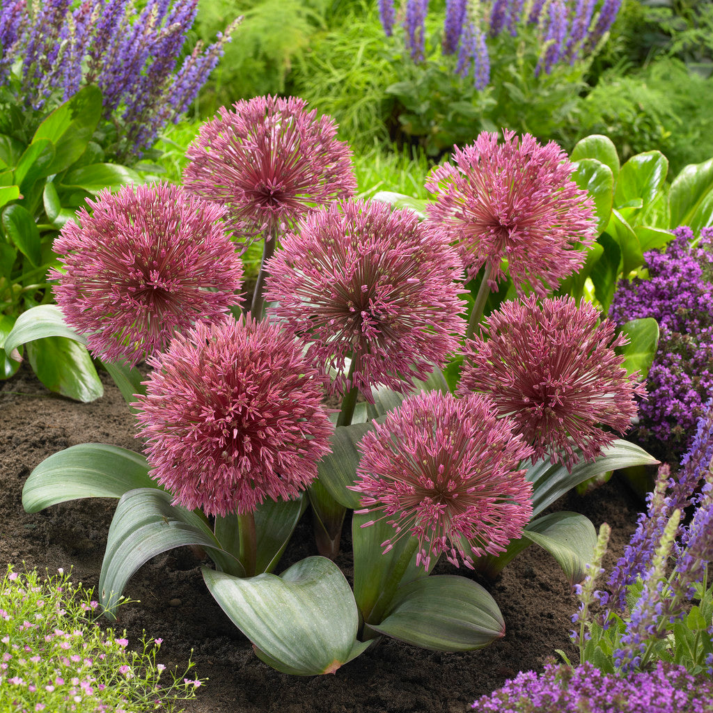Il fogliame nastriforme, ampio e dalla tonalità verde glauco, sviluppa una texture morbida e vellutata capace di valorizzare le tinte vivaci dei fiori. Gli steli fiorali, alti in media 20-30 cm, sono robusti e proporzionati, sostenendo con eleganza le sfere fiorite senza necessità di tutori. Un elemento distintivo di questa varietà è la persistenza decorativa delle foglie anche dopo la piena fioritura, caratteristica non comune in molti allium a fioritura primaverile. Questo contribuisce a mantenere l’appeal estetico della pianta per gran parte della stagione vegetativa.