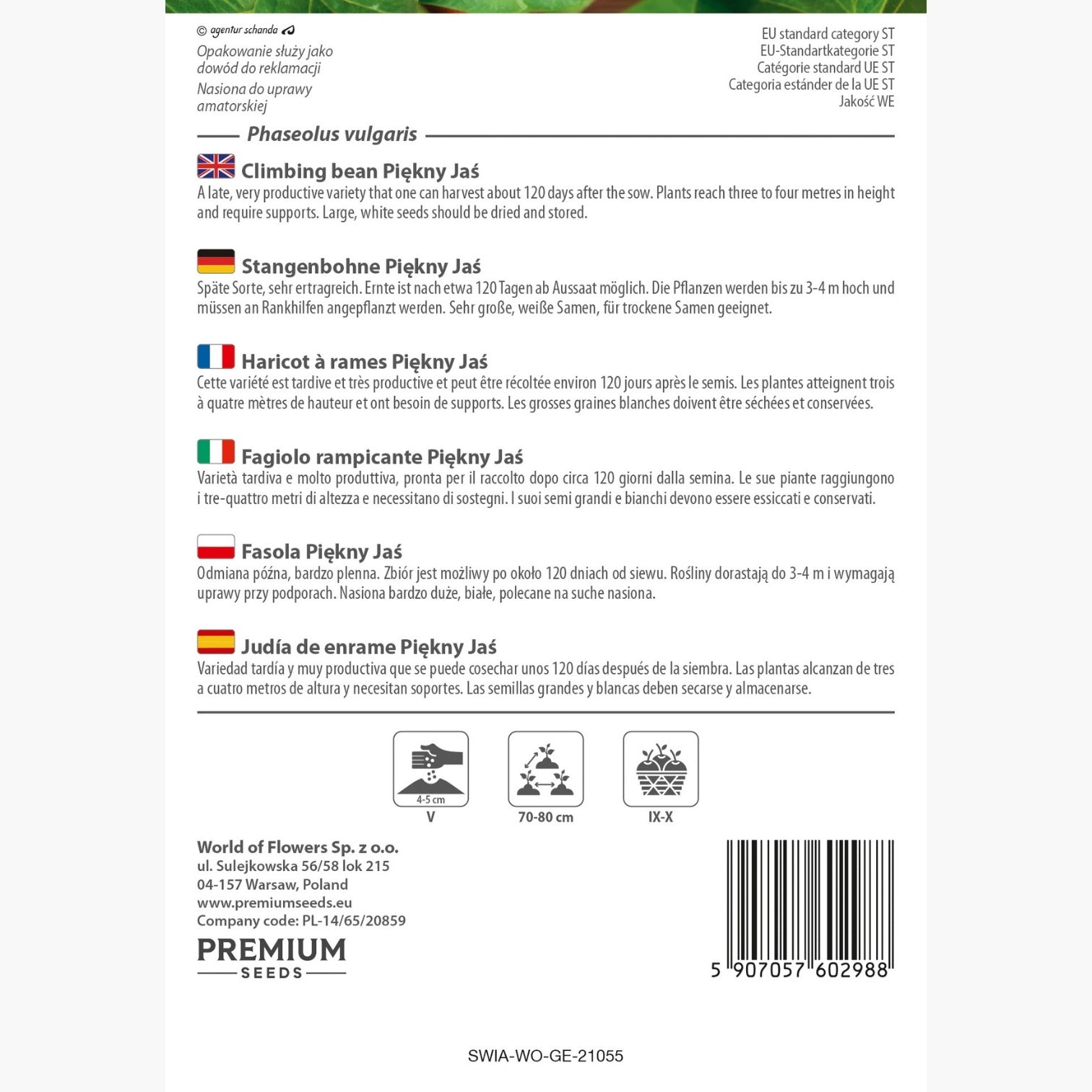 Il fagiolo rampicante Piękny Jaś è una varietà di Phaseolus vulgaris particolarmente apprezzata dagli orticoltori per la sua produzione abbondante e per la bellezza dei suoi grandi semi bianchi. Questa cultivar tardiva si distingue per la notevole vigoria delle sue piante, che possono raggiungere in altezza i tre-quattro metri, rendendo necessari sostegni solidi come reti o canne per sostenere lo sviluppo verticale.