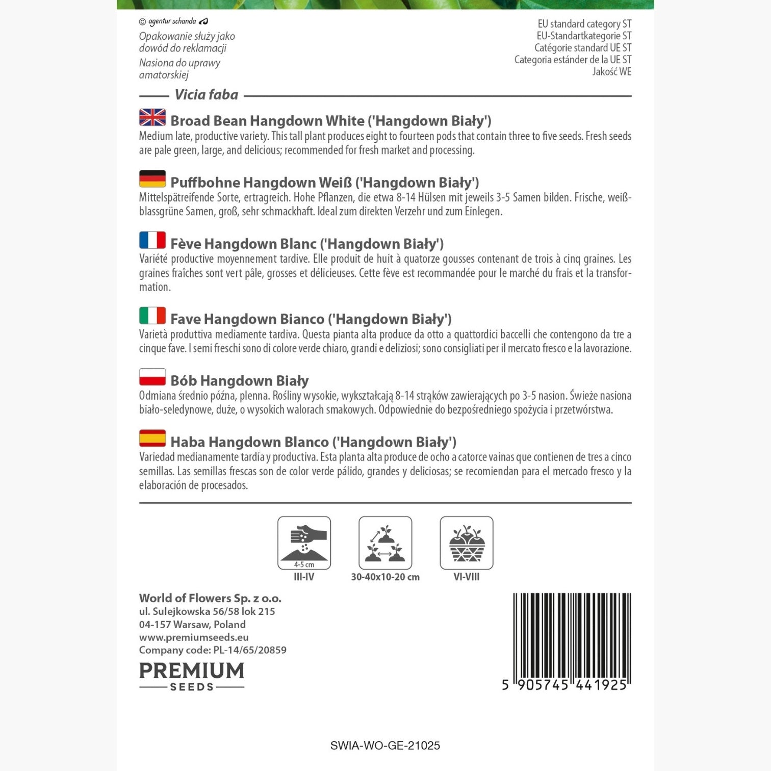 Le Fave Hangdown Bianco (Vicia faba) rappresentano una varietà produttiva mediamente tardiva che sicuramente conquisterà gli appassionati di giardinaggio. Queste piante alte e robuste, veri e propri testimonial di qualità e resa, sono capaci di produrre da otto a quattordici baccelli per pianta. Ogni baccello contiene da tre a cinque fave. Le fave fresche si distinguono per il loro colore verde chiaro, le dimensioni generose e il sapore delizioso, risultando ideali sia per il consumo fresco che per la lavorazione.