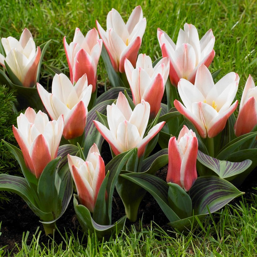 Il tulipano Heart's Delight annuncia la primavera con un portamento compatto e un'armonia di colori che cattura lo sguardo fin dai primi accenni di sole di marzo. I petali si aprono mostrando sfumature rosa intenso sfumate verso il bianco crema, talvolta con leggere venature più scure, creando un contrasto vibrante con il fogliame verde bluastro. Questo effetto cromatico, arricchito dalla forma elegante dei fiori, lo rende perfetto per chi desidera dare profondità visiva e raffinatezza agli spazi verdi ancora spogli dopo l'inverno.