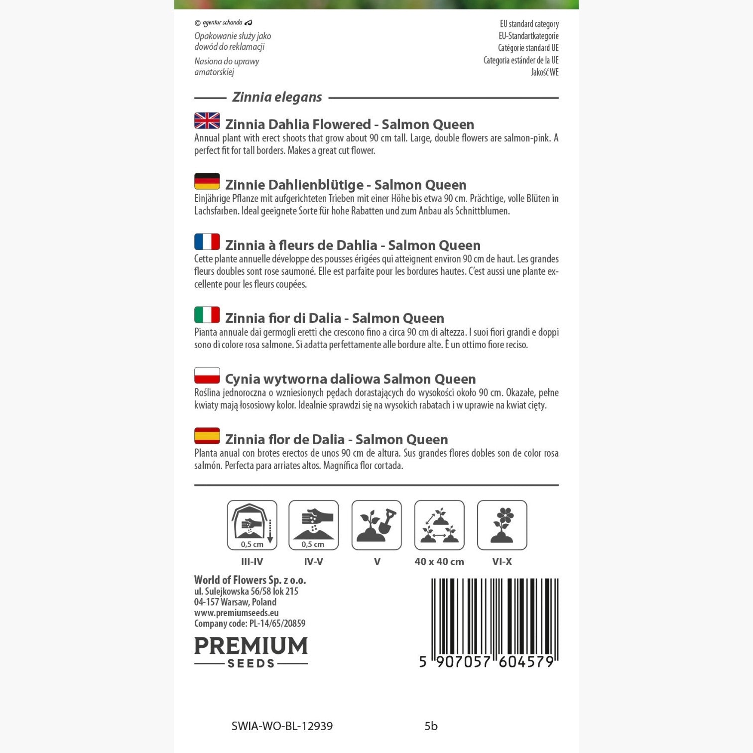 La zinnia fior di dalia - Salmon Queen è una varietà particolarmente apprezzata per i suoi fiori grandi e doppi dal delicato colore rosa salmone, capaci di donare al giardino una nota elegante e raffinata. Appartenente alla specie Zinnia elegans, questa pianta annuale si sviluppa con portamento eretto e può raggiungere un’altezza di circa 90 cm, risultando così ideale sia per la creazione di bordure alte sia come sofisticato fiore reciso da inserire in composizioni floreali.